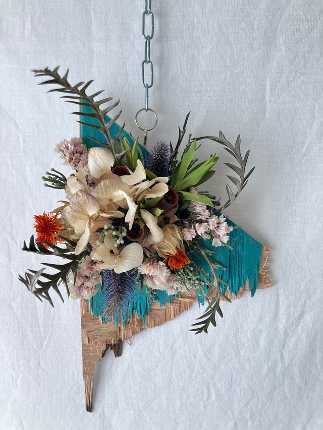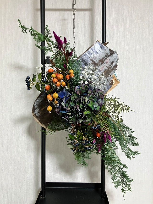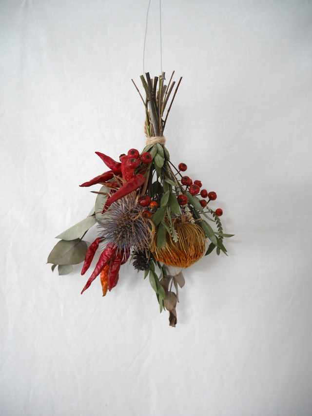 冬に暖かみの感じられるスワッグを。 「warm」をテーマに制作した 生花からドライへと変化するスワッグです。 花の色や素材感などで触りたくなるような 暖かみを演出します。 写真はイメージです。 ご注文ごとに制作し、お届けします。 お花の内容にご希望がありましたらお聞かせください。 おまかせの場合はその時期に状態のよいものでお作りします。 使う花材によってボリュームには差が出ます。 写真のもので、サイズは約H45 W25 D16 です。 こちらは他商品との同梱はできません。 配送の途中で少し葉や実が落ちたりする可能性があります。 ご了承の上、お買い求めください。 また、ドライフラワーになりゆく過程や ドライフラワーになってからも時間と共に色や質感が変化していきます。 なるべく湿気が少なく風通しのよい、直射日光が当たらないところに飾ると、長く楽しんでいただけます。 ご質問はお気軽にご連絡ください。