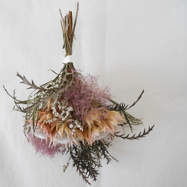 ドライにした蓮台、ベルガムナッツ リューカデンドロンなどをブーケにしました。 ブーケなので花瓶などに立てて飾っても美しく、 またスワッグとして壁面などに飾って頂くこともできます。 お好みに合わせて楽しんでください。 サイズ H 45cm W 53cm D 35cm こちらは他商品との同梱はできません。 ドライフラワーは配送の途中で多少葉っぱが落ちたりする可能性のあるものです。 ご了承の上、お買い求めください。 また、ドライフラワーといえど時間と共に変化していくものです。 なるべく湿気が少なく直射日光が当たらないところに飾ると、長く楽しんでいただけます。 ご注文後2〜3日中に梱包作業を行います。 その後の出荷となります。 着日のご相談は備考欄、またはチャットでご相談ください。 なにかご質問等ございましたらお気軽にご連絡下さい。