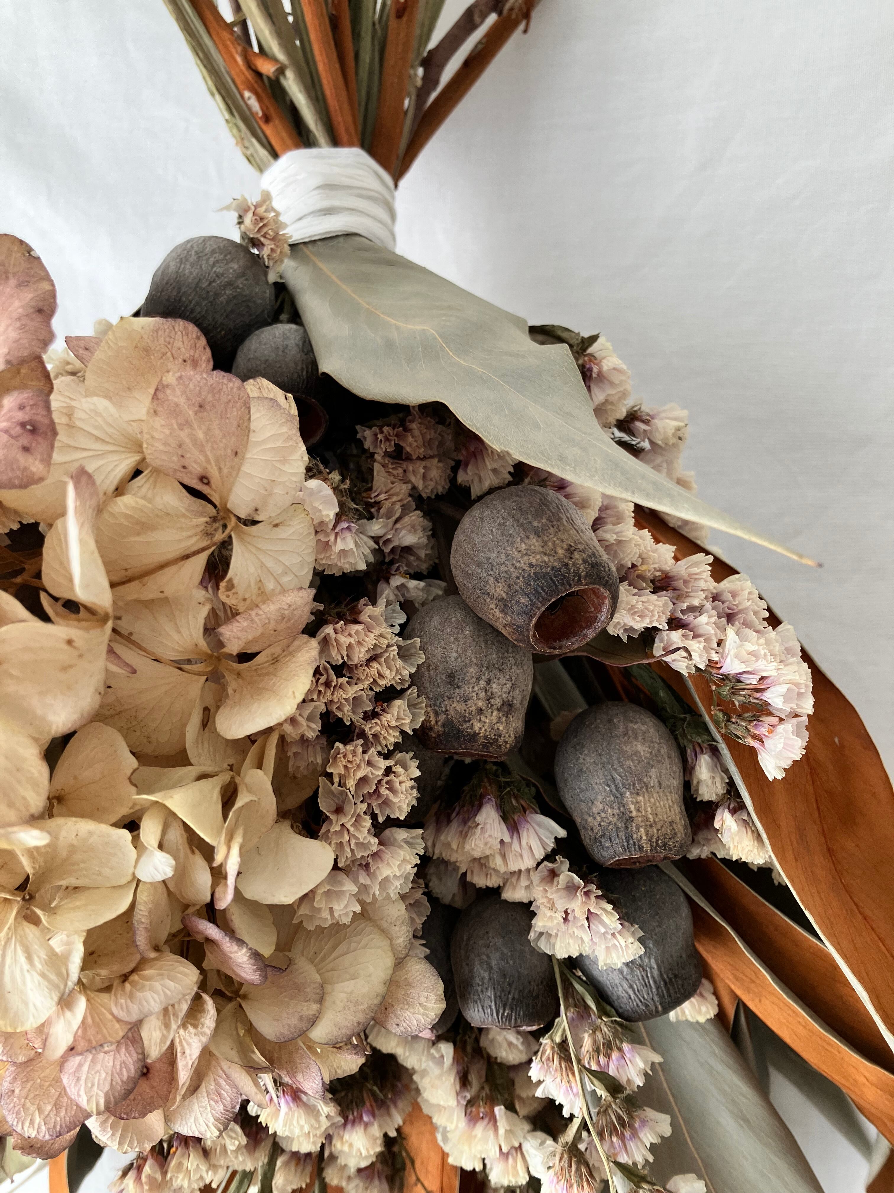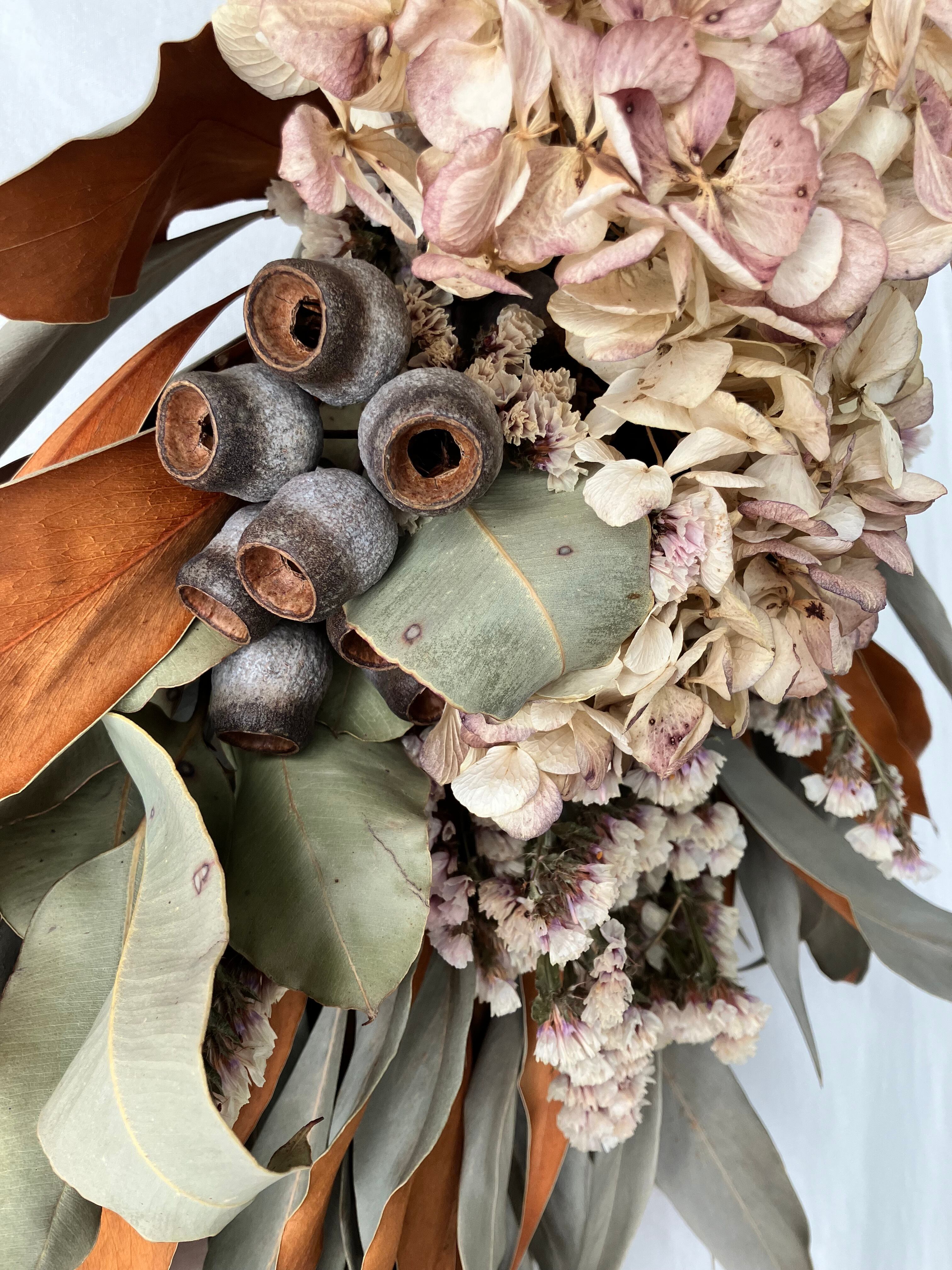 優しい秋色を楽しんでいただけたら、と思い、ドライにしたアジサイ、ベルガムナッツ、スターチスをグレビレアゴールドと束ねてスワッグにしました。